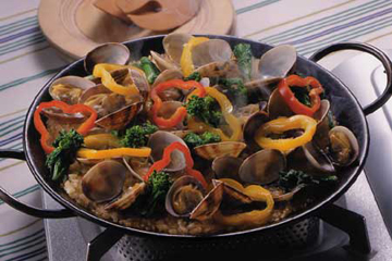 - 在鍋里面往上橄欖油,燒執(zhí)熱后先把蒜放入鍋里炒,再加入花甲和西蘭花一起炒,放上鹽,胡椒。炒到花甲開口,倒入白葡萄酒1匙。