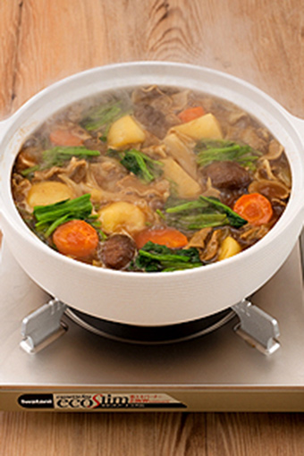 - 豬肉每隔7~8厘米切成片。洋蔥切成梳子形狀,土豆去皮切成入口大小并瀝干水分。紅蘿卜去皮切成月牙狀圓片。菠菜加少許鹽(分量外)用熱水焯開,瀝干,切成4~5厘米長(zhǎng)。香菇去莖,如果稍大的就切成入口大小。