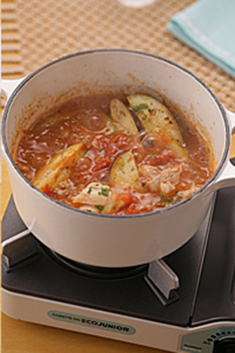 - 鍋中放入番茄,淋一圈酒。開(kāi)中火,蓋上鍋蓋煮7-8分鐘。水分蒸發(fā)后撇除浮沫,煮沸后加入豆瓣醬,再將調(diào)料A依次加入,再煮2-3分鐘。加入雞腿肉,西芹和茄子,蓋上蓋子再煮4-5分鐘即可。