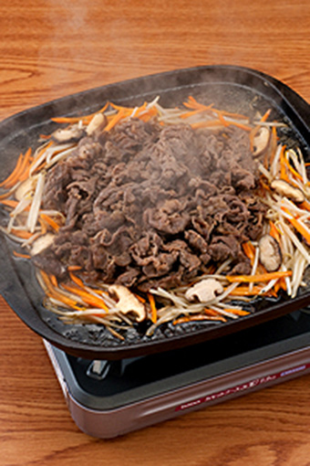 - 把我們喜愛(ài)的烤肉盤(pán)用大火加熱,倒入芝麻油調(diào)和味道。將腌制好的牛肉倒入盤(pán)中翻炒,待肉的顏色變深,煮出汁后,再將步驟1的蔬菜倒入一齊翻炒即可。